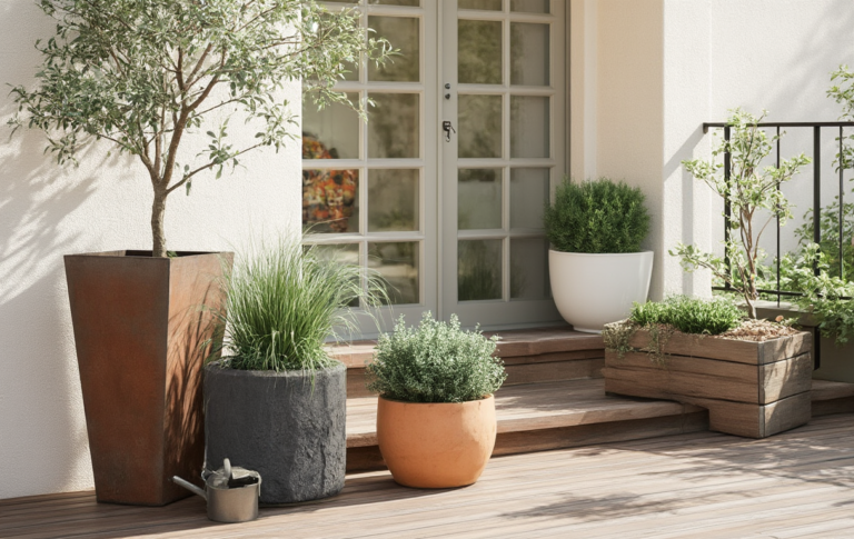 Wähle UV‑beständige, frostfeste und bruchfeste Materialien; leichte Terrakotta‑Alternativen bieten Langlebigkeit und bessere Isolierung, damit du weniger umtopfen musst.